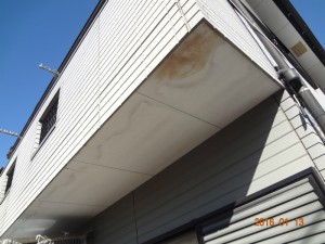 写真右角の茶色いシミだけではなく、ベランダ天井全体的に雨染みの