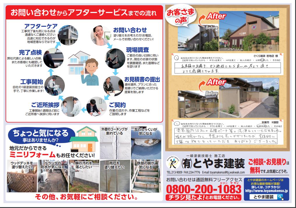 住宅の塗り替え、吹付工事、各種防水工事のことなら、岐阜県岐阜市にある地元密着の「とやま建装」にお任せください! 会社概要 対応エリア 受付時間【09:00~18:00】 HOME 選ばれる理由 NEWキャンペーン 塗料講座 塗装の流れ 施工事例 お客様の声 会社概要 HOME 選ばれる理由 NEWキャンペーン 塗料講座 塗装の流れ 施工事例 お客様の声 会社概要 28日に折込チラシを配布いたします! 次へ 前へ 一覧へ 2023年1月24日 みなさんこんにちは。 今週の土曜日に、対象地域に折込チラシを配布致しました! キャンペーンもございます!! 外壁・屋根の塗り替えやお家の状態が気になる方はお気軽にご相談ください。 次へ 前へ 一覧へ