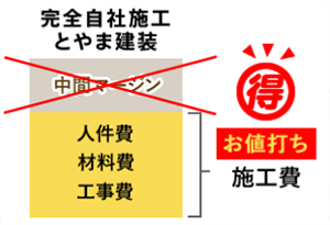 とやま建装は職人直営店です。 そのため、お客様のご相談窓口から、実際の施行まで一貫してとやま建装が対応しております。そのため、余計な中間マージンが発生することは一切ありません。 この“余計な中間マージンがない”ことが、お客様にお値打ち価格で塗り替えをご提供できる秘訣なのです。