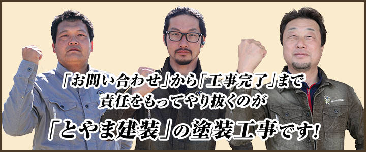 とやま建装は、『安心の完全自社施工』をおこなっております。 自社職人による“プロ”の責任施工だからこそ、高品質の“最高の工事”を提供できるのです。 とやま建装の職人は、下地処理から仕上げまで優れた塗装技術でお客様にご満足していただける塗り替えを提供させていただきます。