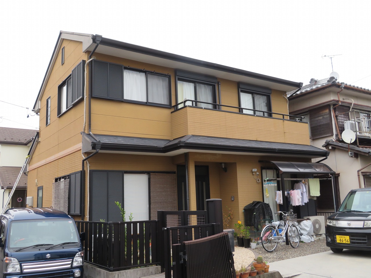 使用塗料はフッ素樹脂塗料、屋根は仕上げに超高耐久クリアー塗料を塗布しています。