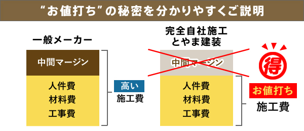 とやま建装は自社で直接職人雇っている『完全自社施工』なので、工事業者との間に無駄な“中間マージン”が発生しません。そのため、営業した業者と工事施工業者の2社による工事と違って余計なお金が掛かることなく、お値打ちな価格を実現することができるのです。